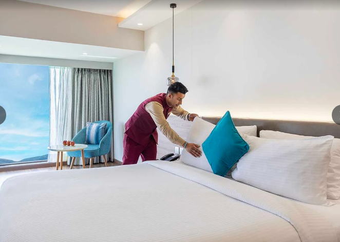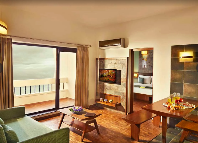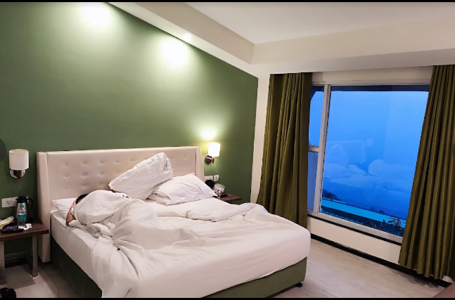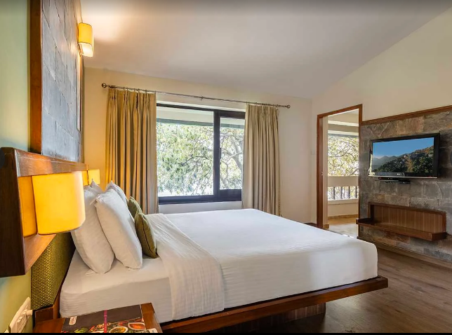 At Sterling Mussoorie, they offer a range of spacious rooms, including Classic Room Valley View, Premiere Room Valley View, Privilege Suite with Valley View, and Family Room (2 Bedroom Apartment). Each room is designed with modern amenities and large windows showcasing the spectacular valley views.