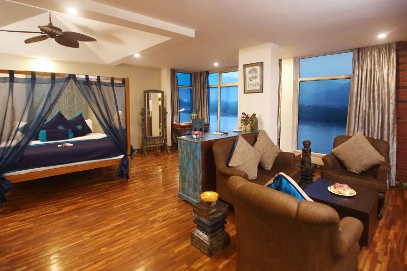 Ganga Kinare features various room options, including Deluxe Rooms with partial river views, Deluxe Rooms with balconies, Family Rooms with partial river views, and the Lotus Suite. Additional amenities include jungle safari options, free parking, bonfires, a restaurant, and indoor games.